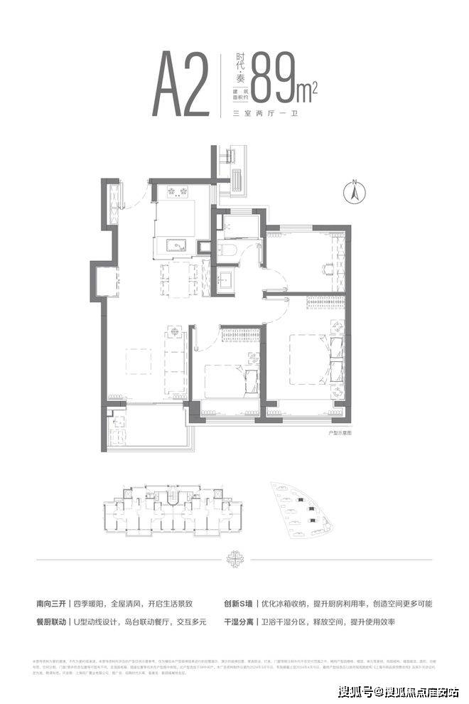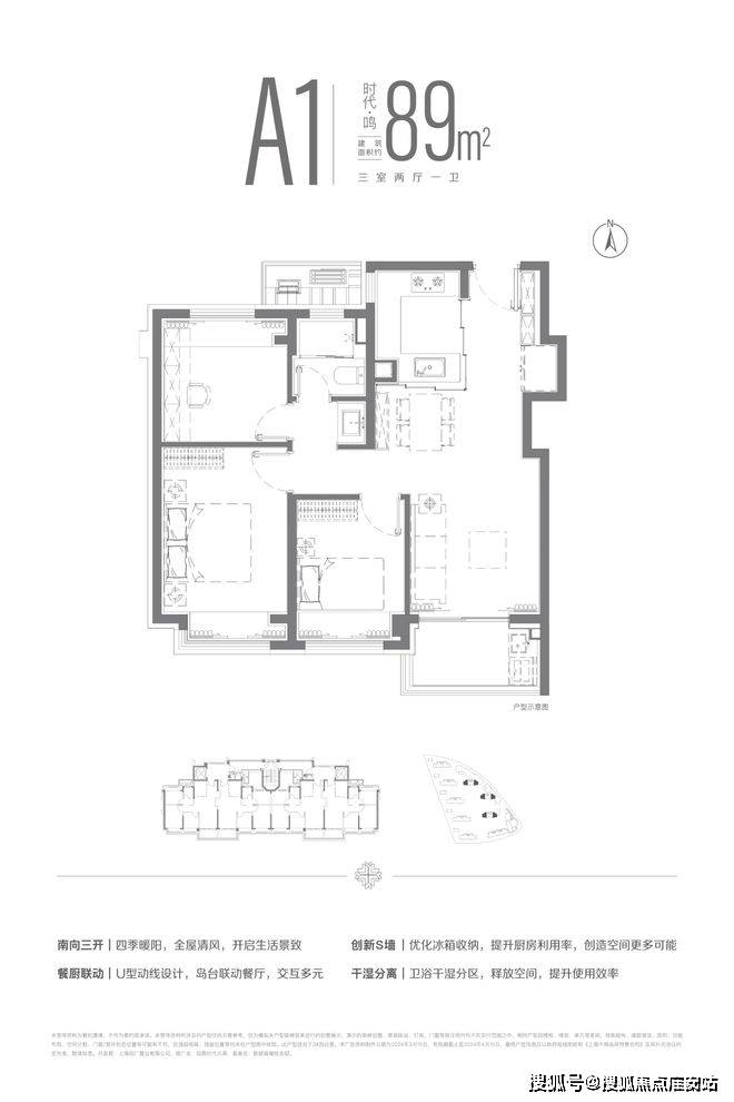 建面约89m²三房两厅一卫户型,拨打招商时代乐章售楼处德律风(已认证)