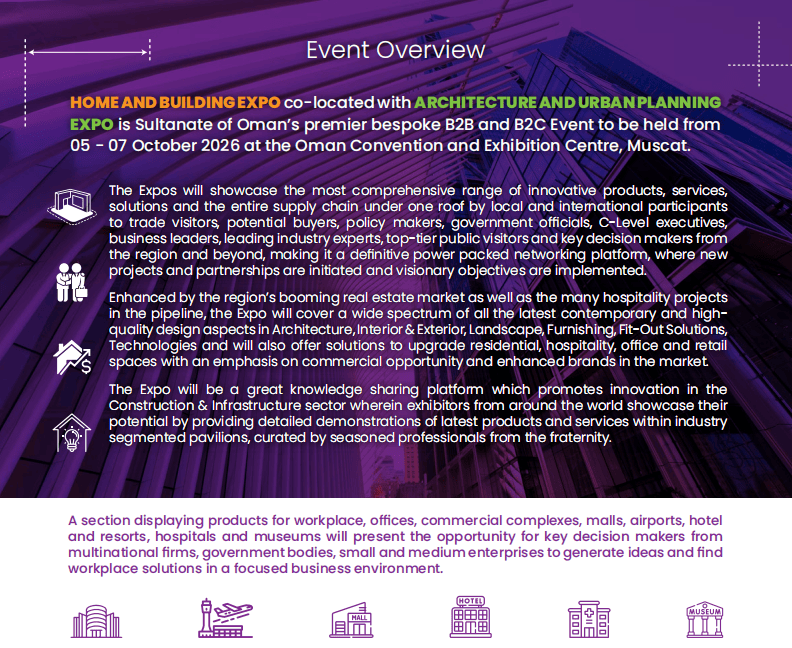 第四届中东(阿曼)国际建建建材、住房取扶植博览会(Oman Home & Building Expo)将正在阿曼马斯喀特会议展览核心昌大启幕,若是你巴望开辟中东市场、对接优良买家、提拔品牌国际影响力,做为阿曼苏丹国首屈一指的定制化B2B取B2C融合型展会,凭仗兴旺的基建海潮和庞大的进口需求!